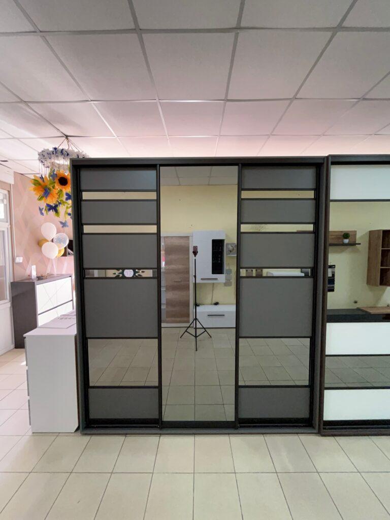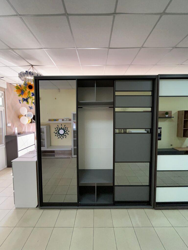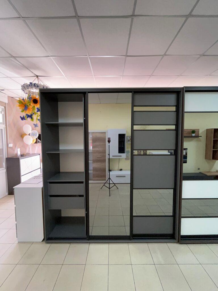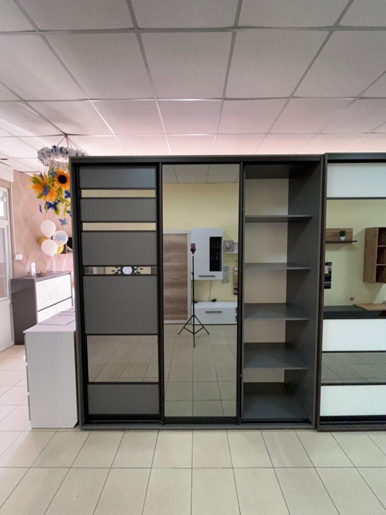 Фасади виконані з ДСП у відтінку Антрацит, що додає конструкції солідності та глибини. Цей колір не лише виглядає ефектно, а й чудово маскує дрібні сліди експлуатації. Основний акцент — тоноване дзеркало Графіт, яке створює преміальний вигляд і водночас візуально розширює кімнату. Дзеркальні дверцята додають легкості інтер’єру та роблять шафу універсальною для спальні, коридору чи гардеробної.